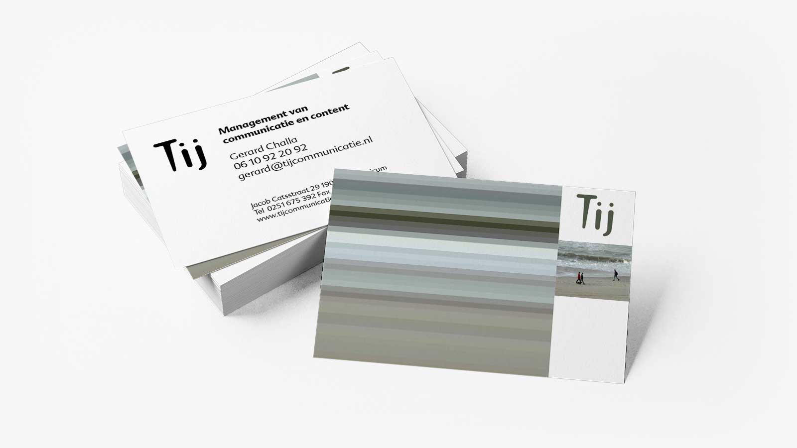 In veel projecten heb ik samengewerkt met copywriter Gerard Challa van Tij Communicatie. Toen hij in 2000 voor zichzelf begon, als communicatie bureau in Castricum aan zee, vroeg hij mij om een logo te maken. Ik ontwierp ene modern typografisch woordmerk voor hem, wat doet denken aan geschilderde of gelaste letters op schepen. Daarnaast ontwikelde ik een beeld motief van horizontale strepen… wat refereert naar het (zee)landschap, en zowel gelaagdheid communiceert als een digitaal karakter heeft. Met deze elementen zijn alle soorten media en formaten op een consistente manier te branden.